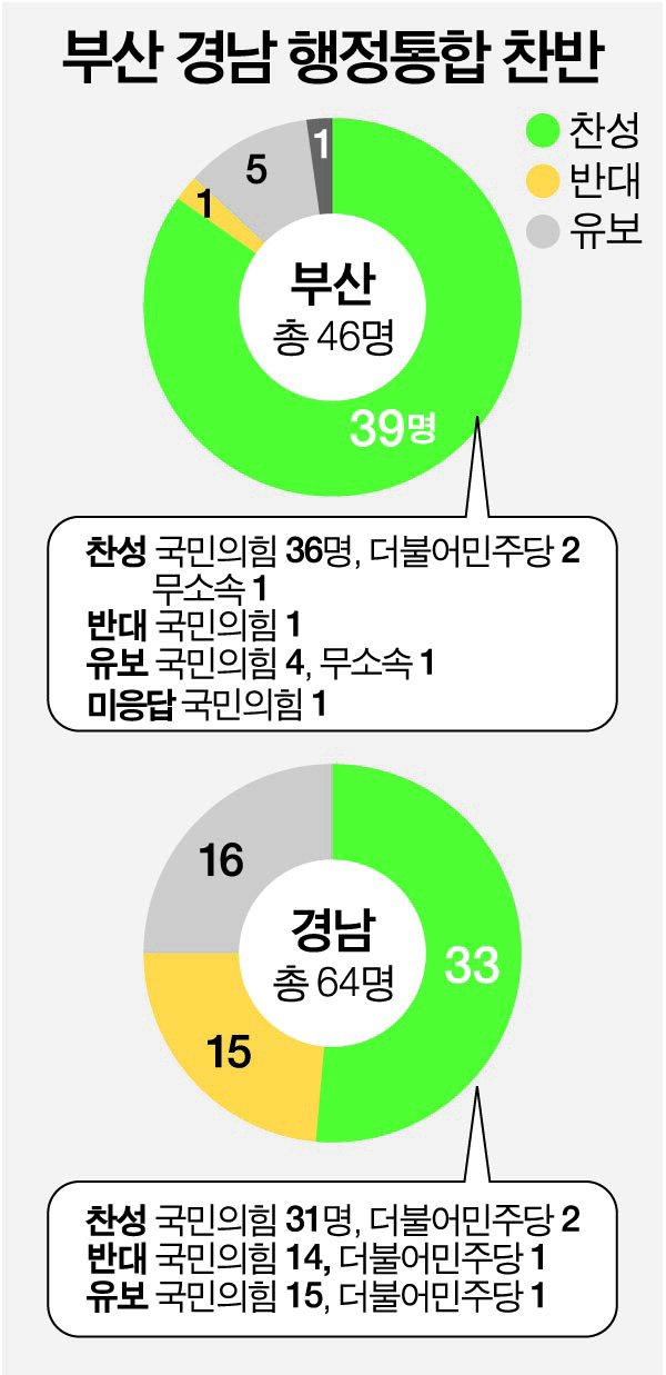 ºÎ»ê½ÃÀÇȸ ÀÇ¿øµéÀº ºÎ»ê¡¤°æ³² ÇàÁ¤ÅëÇÕ¿¡ ¾ÐµµÀûÀ¸·Î Âù¼ºÇß´Ù. ´ë´Ù¼ö´Â ºÎ»ê¡¤°æ³²ÀÇ ÅëÇÕÀ¸·Î ¼öµµ±Ç ÀϱØÃ¼Á¦¸¦ ¸·À» ¼ö ÀÖ´Â °Å´ë °æÁ¦±ÇÀÌ Åº»ýÇÒ ¼ö ÀÖ´Ù¸é¼ È¯¿µÇß´Ù. ´Ù¸¸ ÀϺΠÀÇ¿øÀº ÇàÁ¤ÅëÇÕ¿¡ Âù¼ºÇϸ鼵µ ½Ã±â¿Í ¹æ¹ý¿¡ ¹®Á¦¸¦ Á¦±âÇÏ¸é¼ ÅëÇÕ ³íÀÇÀÇ ¼ÓµµÀüÀ» °æ°èÇß´Ù.