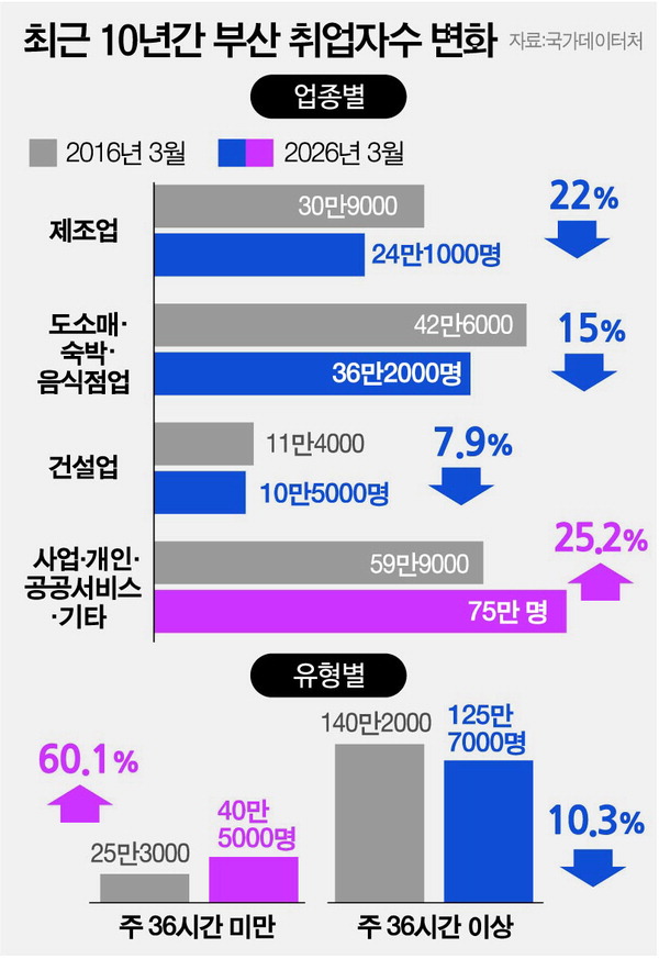 ÀÌ·¸´Ù º¸´Ï Áö³ 10³â°£ ½Ç¾÷·üÀ» º¸¸é 2016³â 3¿ù ±âÁØ 4.2%¿¡ ´ÞÇßÀ¸³ª 2025³â 3¿ù¿¡´Â 2.8%·Î ³·¾ÆÁ³´Ù. ºÎ»êÀÇ 60¼¼ ÀÌ»ó Ãë¾÷ÀÚ ºñÁß(25.0%)Àº 8´ë Ưº°¡¤±¤¿ª½Ã °¡¿îµ¥ 1À§´Ù. Áö³ 3¿ù °í·É Ãë¾÷ÀÚ ¼ö(42¸¸3000¸í)´Â û³â Ãë¾÷ÀÚ(19¸¸8000¸í)ÀÇ 2¹è ÀÌ»óÀ» ±â·ÏÇß´Ù. °æÁ¦È°µ¿ÀÌ È°¹ßÇÑ Ã»³âº¸´Ù °í·É Ãë¾÷ÀÚ°¡ ¾ÐµµÀûÀ¸·Î ¸¹Àº Á¡Àº Áö¿ª °æÁ¦ À§ÃàÀ¸·Î À̾îÁú ¼ö ÀÖ´Ù´Â Á¡¿¡¼ ¿ì·Á¸¦ ´õÇÑ´Ù.