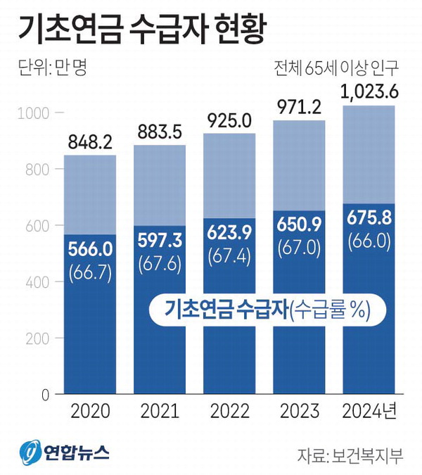 | 65¼¼ ÀÌ»ó ³ëÀÎ Áß ±âÃÊ¿¬±ÝÀ» ¹ÞÀº ºñÀ²ÀÌ 2024³â 66%·Î Áý°èµÆ´Ù. ¿¬ÇÕ´º½º |