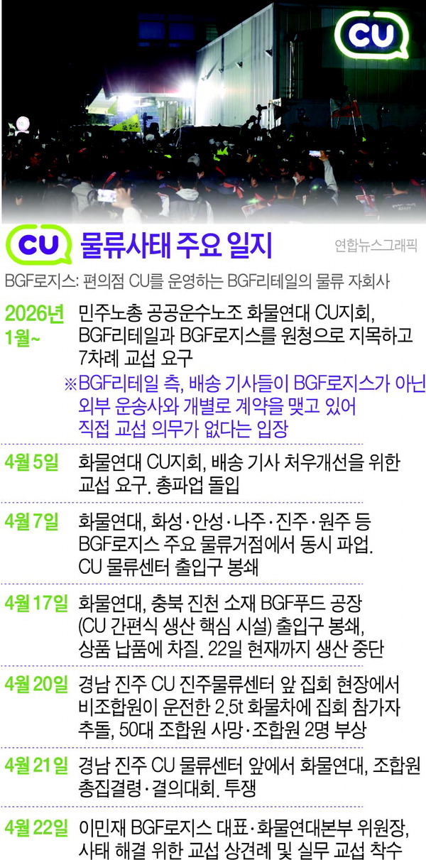 ȹ°¿¬´ë´Â CU ÆíÀÇÁ¡ ¿î¿µ ¸ðȸ»çÀÎ BGF¸®Å×ÀÏÀÌ ¿øÃ»À̶ó¸ç Áö³ 1¿ùºÎÅÍ ±³¼·À» ¿ä±¸ÇؿԴÙ. BGF¸®Å×ÀÏÀº Á÷Á¢ ±³¼· ´ë»óÀÌ ¾Æ´Ï¶ó´Â ÀÔÀåÀ» º¸¿© ȹ°¿¬´ë°¡ Áýȸ¸¦ ¿©´Â µî °¥µîÀÌ ºÒ°ÅÁ³´Ù. BGF·ÎÁö½º´Â ÆíÀÇÁ¡ ³³Ç° ¹°·ù¿Í ¿î¼ÛÀ» ´ã´çÇÏ´Â BGF¸®Å×ÀÏÀÇ ÀÚȸ»ç´Ù.±×·¯´Ù Áö³ 20ÀÏ ¿ÀÀü 10½Ã32ºÐ °æ³² ÁøÁÖ CU ÁøÁÖ¹°·ù¼¾ÅÍ ¾Õ ȹ°¿¬´ë Áýȸ ÇöÀå¿¡¼ ÃâÂ÷ÇÏ´Â ´ëü Â÷·®À» ¸·´ø 50´ë Á¶ÇÕ¿ø 1¸íÀÌ »ç¸ÁÇÏ´Â »ç°í°¡ ¹ß»ýÇß´Ù. Á¶ÇÕ¿øÀÌ ¼ûÁö¸é¼ ȹ°¿¬´ë°¡ ÃѰáÁý¿¡ ³ª¼´Â µî »çŰ¡ Ä¿Á³°í, ºÎ»ê µî Áö¿ª¿¡µµ ¹°·ù ´ë¶õÀÌ È®»êÇÒ Á¶ÁüÀ» º¸¿´´Ù. ÀÌ¹Ì ¼öµµ±Ç µîÀº CUÆíÀÇÁ¡ ¹°·ù ¼ö±Þ¿¡ Â÷ÁúÀ» ºú¾î Á¡ÁÖµéÀÌ »ý°è¸¦ À§Çù¹Þ´Â´Ù.