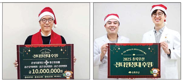 Àº¼ºÀÇ·áÀç´Ü ÁÁÀºº´¿øµé(ÀÌ»çÀå ±¸ÀÚ¼º)Àº Áö³­ 21ÀÏ ÃÊ·Ï¿ì»ê(ºÎ¿ï°æ±Ç¿ªÃѰýº»ºÎÀå À̼ö°æ)¿¡ »êŸ¿øÁ¤´ë ¼Ò¿ø¼ºÃë ÈÄ¿ø±Ý 1000¸¸ ¿øÀ» Àü´ÞÇß´Ù. ±¸ÀÚ¼º ÀÌ»çÀåÀº ¡°ÃÊ·Ï¿ì»ê »êŸ¿øÁ¤´ë¸¦ ÅëÇØ ¾ÆÀ̵éÀÇ ¼Ò¿øÀ» ÀÌ·ïÁÖ´Â ±â»ÝÀ» ¼±¹°·Î ¹Þ°í ÀÖ¾î 10³â° ÇÔ²²Çϰí ÀÖ´Ù¡±¸ç ¡°¿ÃÇØµµ ¾î¸°À̵éÀÌ µû¶æÇÑ ¿¬¸»À» º¸³»°í, ´õ ³ªÀº ³»ÀÏÀ» ²Þ²Ù¸ç ÇÑ ÇØ¸¦ ¸¶¹«¸®ÇÒ ¼ö Àֱ⸦ ¹Ù¶õ´Ù¡±°í ¸»Çß´Ù.