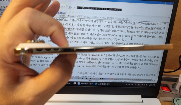 º»Ã¼ ¿·¸é¿¡´Â ƼŸ´½ ÇÁ·¹ÀÓ(5µî±Þ)À¸·Î ¸¶°¨µÆ´Ù. ƼŸ´½Àº Ç×°ø±â¿¡ µé¾î°¡´Â ¼ÒÀç·Î °¡º±°í °µµ°¡ ¼¼´Ù. µð½ºÇ÷¹ÀÌ ÃÊ´ç ±ôºýÀÓÀº ÃÖ´ë 120Hz. 6.53ÀÎÄ¡(16.6cm) Retina XDR µð½ºÇ÷¹À̰¡ µé¾î°¬´Ù. ¾ÆÀÌÆù ¿¡¾î´Â ½ºÆäÀ̽º ºí·¢, Ŭ¶ó¿ìµå ÈÀÌÆ®, ¶óÀÌÆ® °ñµå, ½ºÄ«ÀÌ ºí·ç ³× °¡Áö »ö»óÀ¸·Î ³ª¿Ô°í ±âÀڴ Ŭ¶ó¿ìµå ÈÀÌÆ® Á¦Ç°À» »ç¿ëÇß´Ù. µÎ²²´Â 5.6mmÀ̸ç ÈĸéÀº Ç÷¡Åä¶ó ºÒ¸®´Â Ä«¸Þ¶ó ¼¶ÀÌ ÀÖ´Ù. ÀÌ Ç÷¡Åä¿¡´Â Ä«¸Þ¶ó, ½ºÇÇÄ¿, ¾ÖÇà ½Ç¸®ÄÜÀÌ Å¾ÀçµÆ´Ù. »ó½Ã Ç¥½ÃÇü µð½ºÇ÷¹ÀÌ, °¡º¯ ÁÖ»çÀ²·Î »ç¿ëÇÏÁö ¾ÊÀ» ¶§¿¡´Â 1Hz·Î ³·Ãß°í ÃÖ´ë ¹à±â´Â 3000 ´ÏÆ®´Ù. ¾ÖÇÃÀº ¾ÆÀÌÆù ¿¡¾î¿¡ °¡Àå ¸¹Àº ±â´ÉÀ» ³Ö°í Ä«¸Þ¶ó¸¸ ´Ü¼øÇÏ°Ô ¹Ù²å´Ù. ÃÊ´ç 60 ÇÁ·¹ÀÓÀÇ 4K Dolby Vision µ¿¿µ»ó ÃÔ¿µÀÌ °¡´ÉÇÏ¸ç ¡®¾×¼Ç ¸ðµå¡¯µµ Áö¿øÇÑ´Ù. µ¿¿µ»óÀÇ °ø°£ À½Çâ, ¹è°æ ¼ÒÀ½À» ÁÙÀÌ´Â ¿Àµð¿À ¹Í½º, ¹Ù¶÷¼Ò¸® °¨¼Ò ±â´Éµµ °¡´ÉÇÏ´Ù.