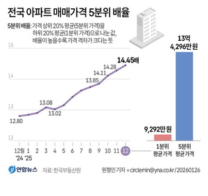 26ÀÏ Çѱ¹ºÎµ¿»ê¿ø¿¡ µû¸£¸é Áö³­ÇØ 12¿ù ±âÁØ Àü±¹ ¾ÆÆÄÆ® ¸Å¸Å½ÃÀå¿¡¼­ °í°¡ ÁÖÅðú Àú°¡ ÁÖÅà °£ Æò±Õ °¡°ÝÂ÷¸¦ ³ªÅ¸³»´Â 5ºÐÀ§ ¹èÀ²Àº 14.45·Î Áý°èµÆ´Ù. 5ºÐÀ§ ¹èÀ²Àº »óÀ§ 20% Æò±Õ(5ºÐÀ§ °¡°Ý)À» ÇÏÀ§ 20% Æò±Õ(1ºÐÀ§ °¡°Ý)À¸·Î ³ª´« °ªÀÌ´Ù. 12¿ù Àü±¹ 5ºÐÀ§ °¡°ÝÀº 13¾ï4296¸¸ ¿ø, 1ºÐÀ§ °¡°ÝÀº 9292¸¸ ¿øÀ̾ú´Ù.