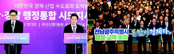 ¹ÚÇüÁØ ºÎ»ê½ÃÀå°ú ¹Ú¿Ï¼ö °æ³²µµÁö»ç°¡ ÇàÁ¤ÅëÇÕ Á¤±¹¿¡¼­ ¡®Àü±¹ 8°³ ½Ã¡¤µµ ´ÜüÀå°úÀÇ ¿¬´ë¡¯ Ä«µå¸¦ Á¦½ÃÇß´Ù. ¹Ú ½ÃÀå°ú ¹Ú Áö»ç°¡ Á¤ºÎÀÇ ÅëÇÕ Àμ¾Æ¼ºê Á¦°øÀ» °ÅºÎÇϸ鼭 ´øÁø ÀÏÁ¾ÀÇ Á¤Ä¡Àû ½ÂºÎ¼ö´Ù. ´Ù¸¸ ±¤ÁÖ¡¤Àü³²°ú ´ëÀü¡¤Ãæ³²Àº ¿©´ç ÁÖµµ·Î ÅëÇÕÆ¯º°¹ý ¹ßÀǰ¡ ÃÊÀб⿡ µé¾î°¬°í, ´ë±¸¡¤°æºÏµµ Àü·Ê ¾ø´Â ¼Óµµ·Î ÅëÇÕ¿¡ ¹ÚÂ÷¸¦ °¡ÇÑ´Ù. ÀÌ ½ÃÁ¡¿¡¼­ µÎ ´ÜüÀå Á¦¾È¿¡ ³ª¸ÓÁö Áö¿ª ´ÜüÀåµéÀÌ È£ÀÀÇÒÁö ¹ÌÁö¼ö´Ù. ƯÈ÷ Ÿ Áö¿ª ´ÜüÀåÀÇ È£ÀÀÀÌ ¾ø´Ù¸é ÇàÁ¤ÅëÇÕ ³íÀÇ¿¡¼­ °¡¶àÀ̳ª µÚóÁø ºÎ»ê¡¤°æ³²ÀÌ ¡®³«¿À¡¯ÇÏ´Â °ÍÀÌ ¾Æ´Ï³Ä´Â ¿ì·Áµµ ³ª¿Â´Ù.