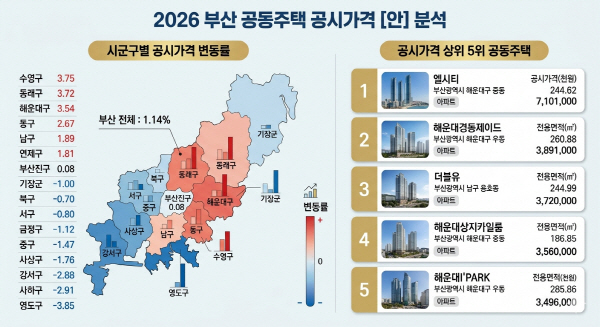 ¾÷°è¿¡¼´Â ¿ÃÇØ ºÎ»êÀÇ °øµ¿ÁÖÅà °ø½Ã°¡°Ý º¯µ¿·üÀÌ 4³â ¸¸¿¡ ¿À¸¥ °Í¿¡ ÁÖ¸ñÇÑ´Ù. ÃÖ±Ù ºÎ»êÀÇ ¼öÄ¡´Â 2022³â 18.19% ÀÌÈÄ 2023³â -18.05%, 2024³â -2.90%, 2025³â -1.67% µîÀ¸·Î °è¼Ó ºÎÁøÇß´Ù. ÇÏÁö¸¸ ¿ÃÇØ¸¦ ±âÁ¡À¸·Î ÀÌ °°Àº »óȲÀÌ °³¼±µÉ ¼ö ÀÖ´Ù°í ³»´Ùº»´Ù. ±¸¡¤±ºº° º¯µ¿·ü ¼øÀ§´Â ¼ö¿µ±¸ 3.75%, µ¿·¡±¸ 3.72%, ÇØ¿î´ë±¸ 3.54%, µ¿±¸ 2.67%, ³²±¸ 1.89%, ¿¬Á¦±¸ 1.81%, ºÎ»êÁø±¸ 0.08%, ºÏ±¸ -0.70%, ¼±¸ -0.80%, ±âÀ屺 -1.00%, ±ÝÁ¤±¸ -1.12%, Áß±¸ -1.47%, »ç»ó±¸ -1.76%, °¼±¸ -2.88%, »çÇϱ¸ -2.91%, ¿µµµ±¸ -3.85% µîÀ̾ú´Ù.