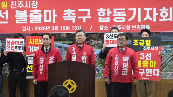 ±¹¹ÎÀÇÈû ÁøÁÖ½ÃÀå ¿¹ºñÈĺ¸ÀÎ ±è±Ç¼ö¡¤¹Ú¸í±Õ¡¤ÇѰæÈ£ È帴 19ÀÏ ÁøÁÖ½Ãû ºê¸®Çη뿡¼ °øµ¿ ±âÀÚȸ°ßÀ» ¿°í Á¶±ÔÀÏ ½ÃÀåÀÇ 3¼± ºÒÃ⸶¸¦ Ã˱¸Çß´Ù.