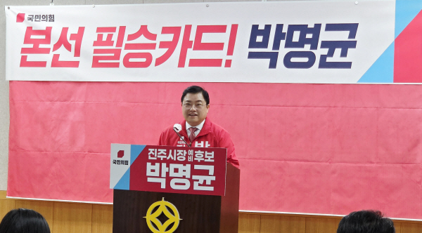 ±¹¹ÎÀÇÈû ¹Ú¸í±Õ ÁøÁÖ½ÃÀå ¿¹ºñÈ帰¡ 6ÀÏ ÁøÁÖ½Ãû ºê¸®Çη뿡¼­ ±âÀÚȸ°ßÀ» ¿­°í ¡°ÁøÁÖÀÇ ÀÚÁ¸½ÉÀ» ¹Ù·Î ¼¼¿ì°í °æ³² ÀüüÀÇ ½Â¸®¸¦ °ßÀÎÇÒ º»¼± Çʽ īµå°¡ µÇ°Ú´Ù¡±°í ¹àÇû´Ù.