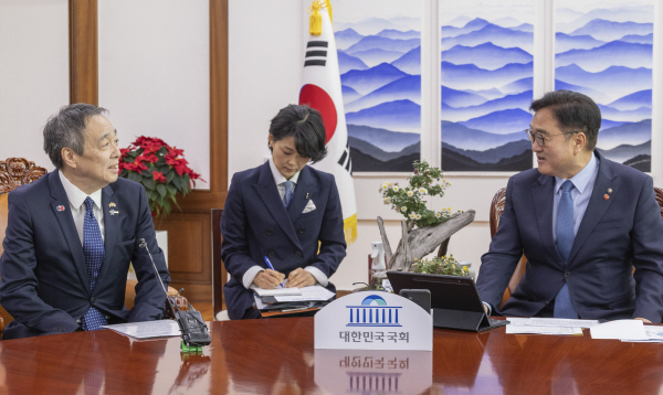 ¿ì¿ø½Ä ±¹È¸ÀÇÀåÀÌ 8ÀÏ ±¹È¸ ÀÇÀå½Ç¿¡¼­ ¹ÌÁî½Ã¸¶ ÄÚÀÌÄ¡ ÁÖÇÑÀϺ»´ë»ç¸¦ ¸¸³ª Àλ縻À» Çϰí ÀÖ´Ù. ¿¬ÇÕ´º½º