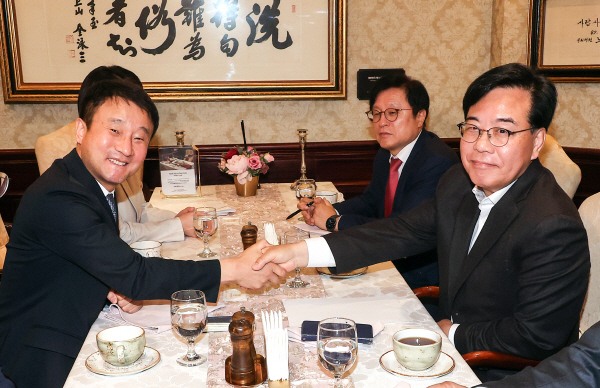 ´õºÒ¾î¹ÎÁÖ´ç ÇѺ´µµ ¿ø³»´ëÇ¥(¿ÞÂÊ)¿Í ±¹¹ÎÀÇÈû ¼Û¾ð¼® ¿ø³»´ëÇ¥°¡ 10ÀÏ ¼­¿ï ¿©Àǵµ Ä˽ÌÅÏ È£ÅÚ¿¡¼­ Ãß°æ¾È °ü·Ã ³íÀǸ¦ Çϱ⿡ ¾Õ¼­ ¾Ç¼öÇϰí ÀÖ´Ù. À̳¯ ȸµ¿¿¡´Â ¿©¾ß ¿ø³»´ëÇ¥, ¿ø³»¿î¿µ¼ö¼®ºÎ´ëÇ¥¿Í ¿¹°áÀ§ °£»çµéÀÌ Âü¼®Çß´Ù. ¿¬ÇÕ´º½º