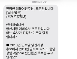 ±èÀ챂 ¿¹ºñÈĺ¸ ÃøÀº Á¶¹®°ü ¿¹ºñÈĺ¸ ÃøÀÌ °á¼± ÅõÇ¥ ½ÃÀÛ Á÷ÀüÀÎ Áö³­ 17ÀÏ ³«¼± ¸ñÀûÀÇ ÇãÀ§»ç½ÇÀÌ ´ã±ä ¹®ÀÚ¸Þ½ÃÁö¸¦ ¹ß¼ÛÇß´Ù°í ÁÖÀåÇß´Ù. ¹®ÀÚ¿¡´Â ¡°2010³â ¹ÎÁÖ´ç ¾ç»ê½ÃÀå Èĺ¸¿¡¼­ 2011³â °ð¹Ù·Î ¹Ú»ç¸ð Áß¾Ó»óÀÓ°í¹®À¸·Î º¯½ÅÇß´ø È帴 ´©±¸Àΰ¡¡±¶ó´Â ³»¿ëÀÌ ´ã°å´Ù. Á¶ Èĺ¸ ÃøÀº ´ÙÀ½ ³¯ Á¤Á¤ ¹®ÀÚ¸¦ ÅëÇØ ¡°¹«¼Ò¼ÓÀ» ¹ÎÁÖ´ç È帷ΠSNSÆÀÀÌ À߸ø Ç¥±âÇß´Ù¡±°í ¹àÇû´Ù.