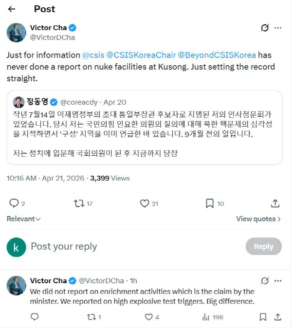 Â÷ ¼®Á´ À̳¯ SNS¿¡ ¡°»ç½Ç°ü°è¸¦ ¹Ù·ÎÀâ´Â´Ù¡±¸ç Á¤ Àå°üÀÇ SNS °Ô½Ã±ÛÀ» °øÀ¯Çß´Ù. ÇØ´ç °Ô½Ã±Û¿¡¼­ Á¤ Àå°üÀº ¡°ºÏÇÑ ±¸¼º Áö¿ª¿¡¼­ ÇÙ°³¹ß Ȱµ¿ÀÌ ÀÖ¾ú´Ù´Â °ÍÀº 2016³â ¹Ì±¹ °úÇб¹Á¦¾Èº¸¿¬±¸¼Ò(ISIS) º¸°í¼­¿Í ±¹³» KBS ´º½º º¸µµ¸¦ ½ÃÀÛÀ¸·Î Áö³­ÇØ ¹Ì±¹ CSIS º¸°í¼­±îÁö ±×µ¿¾È ¹Ýº¹ÀûÀ¸·Î Á¦±âµÆ´Ù¡±°í ¹àÇû´Ù.