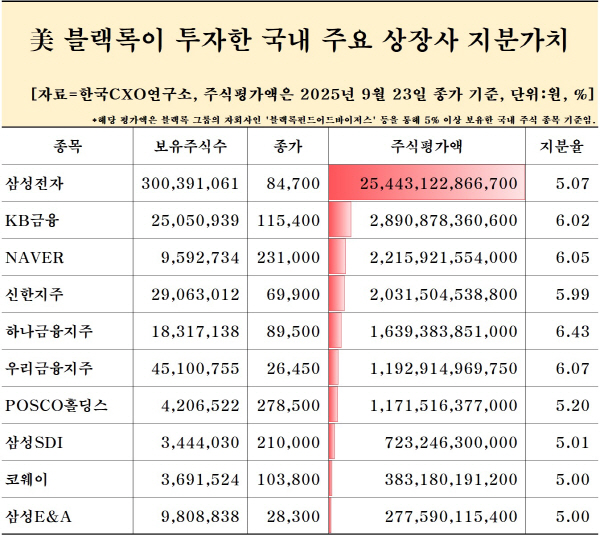 ±â¾÷ºÐ¼®Àü¹® Çѱ¹CXO¿¬±¸¼Ò´Â 24ÀÏ ¡®¹Ì±¹ ÀÚ»ê¿î¿ë»ç ºí·¢·ÏÀÌ ±¹³» »óÀå»ç¿¡¼ 5% ÀÌ»ó ÁöºÐÀ» º¸À¯ÇÑ Á¾¸ñ¿¡ ´ëÇÑ Áֽįò°¡¾× ºÐ¼®¡¯¿¡¼ À̰°ÀÌ ¹àÇû´Ù. Á¶»ç ´ë»óÀº ±¹³» »óÀå»ç Áß ¹Ì±¹ ÀÚ»ê¿î¿ë»ç ºí·¢·ÏÀÌ 5% ÀÌ»ó ÁÖ½ÄÀ» º¸À¯ÇÑ Á¾¸ñ ´ë»óÀ̰í, Áֽįò°¡¾×Àº ÀÌ´Þ 23ÀÏ Á¾°¡(ðûʤ) ±âÁØÀ¸·Î Æò°¡°¡ ÀÌ·ïÁ³´Ù. 5% ¹Ì¸¸À¸·Î ÁÖ½ÄÀ» º¸À¯ÇÑ Á¾¸ñÀº Á¶»ç ´ë»ó¿¡¼ Á¦¿ÜµÆ´Ù.