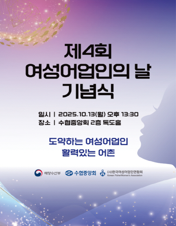 ÇØ¾ç¼ö»êºÎ´Â 13ÀÏ ¼öÇùÁß¾Óȸ µ¶µµÈ¦¿¡¼ ¡®¿©¼º ¾î¾÷ÀÎÀÇ ³¯ ±â³ä½Ä¡¯À» ÁøÇàÇÑ´Ù°í 12ÀÏ ¹àÇû´Ù. ¿ÃÇØ Çà»ç´Â Áö³ 2022³â ÀÌÈÄ ³× ¹øÂ°´Ù. Á¤ºÎ´Â Áö³ 2021³â ¡®¿©¼º³ó¾î¾÷ÀÎÀ°¼º¹ý¡¯À» °³Á¤, 10¿ù 10ÀÏÀ» ¹ýÁ¤±â³äÀÏÀÎ ¿©¼º¾î¾÷ÀÎÀÇ ³¯·Î ÁöÁ¤ÇÑ ¹Ù ÀÖ´Ù. ÇöÀç ¿ì¸®³ª¶ó ¿©¼º ¾î¾÷ÀÎÀº 4¸¸2000¿© ¸íÀ¸·Î Áý°èµÆ´Ù. Àüü ¾î°¡ Àα¸ÀÇ Àý¹Ý°¡·®À» Â÷ÁöÇÑ´Ù. »ý»ê¡¤°¡°ø¡¤À¯Åë µî ¼ö»ê¾÷ Àü ºÐ¾ß¿¡¼ ÀÏÇÏ¸é¼ ¾îÃÌ »çȸ¿¡ Ȱ·ÂÀ» ºÒ¾î³Ö´Â ÇÑÆí ¼ö»ê¾÷ ¹ßÀüÀ» À̲ô´Â Áß¿äÇÑ ÁÖü·Î ÀÚ¸®¸Å±èÇß´Ù.