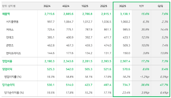 ³×À̹ö¢ß´Â 2025³â 3ºÐ±â¿¡ ¸ÅÃâ¾× 3Á¶1381¾ï ¿ø, ¿µ¾÷ÀÌÀÍ 5706¾ï ¿ø, ´ç±â¼øÀÌÀÍ 7347¾ï ¿øÀ» °¢°¢ ±â·ÏÇß´Ù°í 5ÀÏ ¹àÇû´Ù. ³×À̹ö´Â À̳¯ ½ÇÀû¹ßÇ¥ ÄÜÆÛ·±½ºÄÝÀ» ¿¾î 3ºÐ±â ¿¬°á ¸ÅÃâ¾×Àº ¼Ä¡Ç÷§Æû, Ä¿¸Ó½º µî ÁÖ¿ä »ç¾÷ ºÎ¹®ÀÌ AI Á¢¸ñ È¿°ú·Î °ßÁ¶ÇÑ ¼ºÀåÀ» À̾¸ç Àü³âµ¿±â ´ëºñ 15.6%, ÀüºÐ±â ´ëºñ 7.6% Áõ°¡ÇÑ 3Á¶1381¾ï ¿øÀ» ´Þ¼ºÇß´Ù°í ¼³¸íÇß´Ù. ¿¬°á ¿µ¾÷ÀÌÀÍÀº Àü³âµ¿±â ´ëºñ 8.6%, ÀüºÐ±â ´ëºñ 9.4% ¼ºÀåÇÑ 5706¾ï ¿øÀ¸·Î ¿ª´ë ÃÖ´ë ±Ô¸ð¸¦ ±â·ÏÇß´Ù.