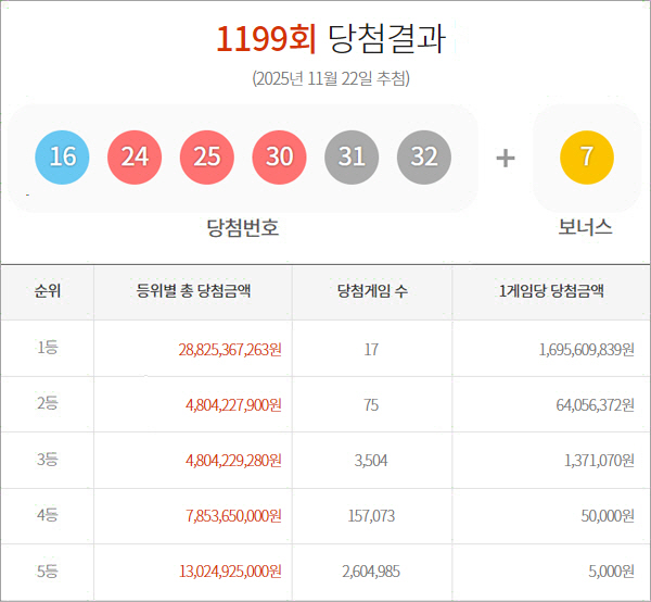 Á¦1199ȸ ·Î¶Çº¹±Ç Ãß÷¿¡¼­ ¡®16, 24, 25, 30, 31, 32¡¯°¡ 1µî ¹øÈ£·Î »ÌÇû´Ù. 2µî º¸³Ê½º ¹øÈ£´Â ¡®7¡¯ÀÌ´Ù.