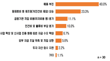 ÀÀ´ä ±â¾÷ÀÇ Àý¹Ý(49.6%) °¡·®Àº ¿ÃÇØ ÀڱݻçÁ¤ÀÌ ÀÛ³â°ú ºñ½ÁÇÑ ¼öÁØÀ̶ó°í ÀÀ´äÇß´Ù. Áö³Çغ¸´Ù ÀڱݻçÁ¤ÀÌ ¾Çȵƴٰí ÀÀ´äÇÑ ºñÁßÀº 27.0%·Î È£Àü(23.4%)µÆ´Ù´Â ÀÀ´äº¸´Ù ³ô¾Ò´Ù. ÀڱݻçÁ¤ÀÌ ¾ÇȵǾú´Ù°í ÀÀ´äÇÑ ±â¾÷µéÀº ±× ¿øÀÎÀ¸·Î ¸ÅÃâ ºÎÁø(40.0%)À» °¡Àå ¸¹ÀÌ ²Å¾Ò°í ÀÌ¾î ¿øÀç·áºñ µî Á¦Á¶¿ø°¡ »ó½Â(23.3%), ±ÝÀ¶±â°ü Â÷ÀÔºñ¿ë Áõ°¡(11.1%) µîÀ» Áö¸ñÇß´Ù.
