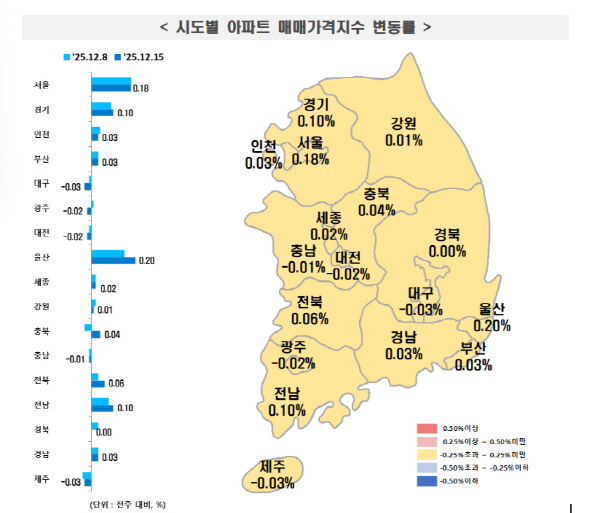 ¼öµµ±Ç°ú ºñ±³ÇÏ¸é ºÎ»êÀÇ »ó½Â·üÀº »ó´ëÀûÀ¸·Î Á¦ÇÑÀûÀÌ´Ù. ¼­¿ïÀº ¸Å¸Å°¡°ÝÀÌ 0.18% »ó½ÂÇÏ¸ç °³¹ß ±â´ë°¨ÀÌ ÀÖ´Â Áö¿ª°ú ´ë´ÜÁö¡¤½ÅÃà ¾ÆÆÄÆ®¸¦ Áß½ÉÀ¸·Î °­ÇÑ È帧À» À̾°í ÀÖ´Ù. ¼öµµ±Ç(0.11%) ¿ª½Ã ¼­¿ï°ú °æ±â ÁÖ¿ä Áö¿ªÀ» Áß½ÉÀ¸·Î »ó½Â¼¼°¡ À¯ÁöµÇ´Â ¸ð½ÀÀÌ´Ù. ¹Ý¸é ºÎ»êÀº ±Þ°ÝÇÑ ¹Ýµîº¸´Ù´Â Áö¿ªº° Â÷º°È­ ¼Ó¿¡¼­ Á¡ÁøÀû ȸº¹ÀÌ ³ªÅ¸³ª°í ÀÖ´Ù´Â Á¡ÀÌ Æ¯Â¡ÀÌ´Ù.