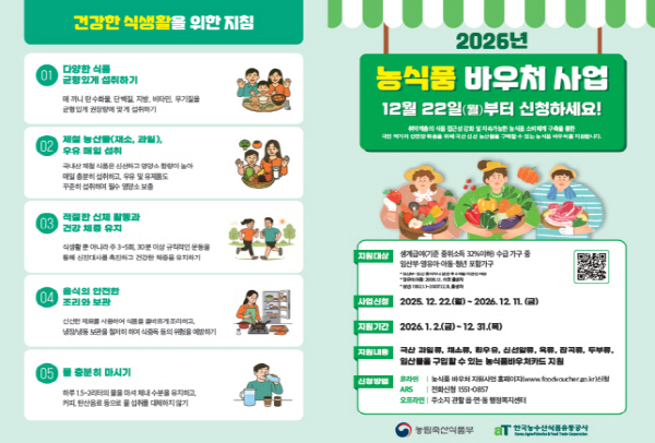³ó¸²Ãà»ê½ÄǰºÎ´Â 22ÀϺÎÅÍ 2026³â 12¿ù 11ÀϱîÁö ³ó½Äǰ ¹Ù¿ìó »ç¾÷ ½ÅûÀ» ¹Þ´Â´Ù°í 21ÀÏ ¹àÇû´Ù. ÁÖ¼ÒÁö °üÇÒ ÇàÁ¤º¹Áö¼¾Å͸¦ ¹æ¹®Çϰųª ³ó½Äǰ ¹Ù¿ìó ´©¸®Áý(www.foodvoucher.go.kr), ARS ÀüÈ­(1551-0857) µî Æí¸®ÇÑ ¹æ½ÄÀ» ÀÌ¿ëÇÏ¸é µÈ´Ù. ¿ÃÇØ ´ë»ó¿¡ Æ÷ÇÔµÈ °¡±¸´Â µû·Î ½ÅûÇÏÁö ¾Ê¾Æµµ ÀÚ°Ý È®ÀÎ ÈÄ ÀÚµ¿À¸·Î ¹Ù¿ìó°¡ Áö±ÞµÈ´Ù.