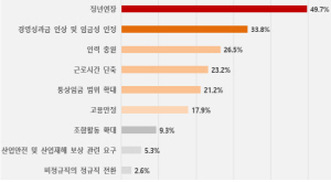 ´ÙÀ½À¸·Î ÀÎ·Â Ãæ¿ø(26.5%), ±Ù·Î½Ã°£ ´ÜÃà(23.2%), Åë»óÀÓ±Ý ¹üÀ§ È®´ë(21.2%), °í¿ë¾ÈÁ¤(17.9%), Á¶ÇÕȰµ¿ È®´ë(9.3%), »ê¾÷¾ÈÀü ¹× »ê¾÷ÀçÇØ º¸»ó °ü·Ã ¿ä±¸(5.3%), ºñÁ¤±ÔÁ÷ÀÇ Á¤±ÔÁ÷ Àüȯ(2.6%) ¼øÀ¸·Î Áý°èµÆ´Ù. ³»³âµµ 2026³â ÀÓ´ÜÇù ¼Ò¿ä±â°£Àº ÀÀ´ä±â¾÷ÀÇ 70% ÀÌ»óÀÌ ¡®3°³¿ù ÀÌ»ó¡¯ ¼Ò¿äµÉ °ÍÀ¸·Î Àü¸ÁÇß´Ù. ¶Ç ÀÀ´ä±â¾÷ÀÇ 72.9%´Â ³»³âµµ ³ë»ç°ü°è°¡ ¿ÃÇØº¸´Ù ´õ ºÒ¾ÈÇØÁú °ÍÀ¸·Î Àü¸ÁÇß´Ù. ³»³âµµ ³ë»ç°ü°è°¡ ºÒ¾ÈÇÒ °ÍÀ̶ó°í Àü¸ÁÇÑ ÁÖ¿ä ÀÌÀ¯·Î´Â ¡®³ë¶õºÀÅõ¹ý ½ÃÇà¿¡ µû¸¥ °¥µî ¹× ³ëµ¿°è ÅõÀï Áõ°¡(83.6%)¡¯ ¡®Á¤³â¿¬Àå, ±Ù·Î½Ã°£ ´ÜÃà µî ³ëµ¿Á¶ÇÕÀÇ ¿ä±¸ ´Ù¾çÈ(52.7%)¡¯¶ó´Â ÀÀ´äÀÌ ³ô°Ô ³ªÅ¸³µ´Ù.