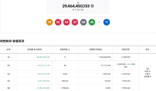 ´ç÷¹øÈ£ 4°³¸¦ ¸ÂÈù 4µî(°íÁ¤ ´ç÷±Ý 5¸¸ ¿ø)Àº 16¸¸ 8020¸í, ´ç÷¹øÈ£ 3°³°¡ ÀÏÄ¡ÇÑ 5µî(°íÁ¤ ´ç÷±Ý 5000¿ø)Àº 275¸¸ 6042¸íÀÌ´Ù.