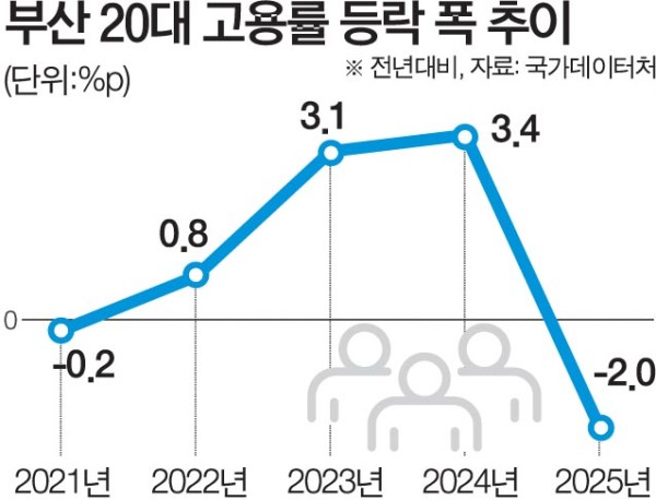Áö³ÇØ ºÎ»ê 20´ë Ãë¾÷ÀÚ ¼öµµ 20¸¸1000¸íÀ¸·Î Àü³âº¸´Ù 1¸¸8000¸í ÁÙ¾ú´Ù. 2022³â(-3000¸í) ÀÌÈÄ 3³â ¸¸¿¡ °¨¼Ò¼¼·Î ÀüȯµÆ´Ù.