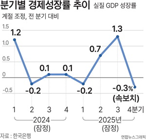 Çѱ¹ÀºÇàÀº 2025³â 4ºÐ±â ½ÇÁú ±¹³»ÃÑ»ý»ê(GDP) ¼ºÀå·ü(Á÷ÀüºÐ±â´ëºñ¡¤¼Óº¸Ä¡)ÀÌ -0.3%·Î Áý°èµÆ´Ù°í 22ÀÏ ¹àÇû´Ù. ºÐ±â ¼ºÀå·üÀº 2024³â 1ºÐ±â 1.2%¸¦ ÂïÀº µÚ 2ºÐ±â¿£ -0.2%±îÁö Ãß¶ôÇß´Ù°¡, 3ºÐ±â(0.1%)¿Í 4ºÐ±â(0.1%) Á¤Ã¼¸¦ °ÅÃÄ Áö³ÇØ 1ºÐ±â(-0.2%) ´Ù½Ã µÞ°ÉÀ½ÃÆ´Ù. ÀÌÈÄ 2ºÐ±â(0.7%) ¹Ýµî¿¡ ¼º°øÇÑ µÚ 3ºÐ±â(1.3%) ¡®±ô¦ ¼ºÀ塯ÇßÁö¸¸ 4ºÐ±â ´Ù½Ã ¿ª(-)¼ºÀåÀ» ±â·ÏÇß´Ù.