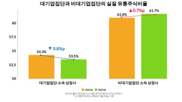 ¸®´õ½ºÀ妽º´Â ½ÃÃÑ »óÀ§ 300´ë ±â¾÷ Áß 2022³âºÎÅÍ 2025³â ¹Ý±â±îÁö ºñ±³ °¡´ÉÇÑ 266°³»çÀÇ ½ÇÁú À¯ÅëÁֽļö¸¦ Á¶»çÇÑ °á°ú(Áö³­ 21ÀÏ ±âÁØ) Áö³­ÇØ ½ÇÁú À¯ÅëÁֽĺñÀ²Àº Æò±Õ 57.1%·Î Áý°èµÆ´Ù°í 27ÀÏ ¹àÇû´Ù. ÄÚ½ºÇǰ¡ 2000~3000¼±À» ¿À°¡´ø 3³â Àü(57.3%) º¸´Ù ¿ÀÈ÷·Á 0.2% Æ÷ÀÎÆ®(p) Ç϶ôÇÑ ¼öÄ¡´Ù. À̹ø Á¶»ç´Â ¡®ÄÚ¸®¾Æ µð½ºÄ«¿îÆ®¡¯ ÇØ¼Ò¸¦ À§ÇØ »ó¹ý °³Á¤ ³íÀǰ¡ º»°ÝÈ­µÈ 2022³âºÎÅÍ ¹ë·ù¾÷ Á¤Ã¥°ú Á¦µµ °³¼±ÀÌ À̾îÁø ÃÖ±Ù 3~4³âÀ» ºÐ¼® ±â°£À¸·Î »ï¾Ò´Ù.