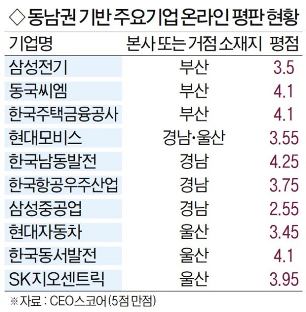 ¹Ý´ë·Î Á÷¿ø ¼ö 1¸¸ ¸í ÀÌ»ó ¹Î°£±â¾÷ Áß ±â¾÷ ÆòÆÇ Á¡¼ö°¡ ³·Àº ´ë±â¾÷¿¡´Â °æ³² °ÅÁ¦¿¡ »ç¾÷ÀåÀ» µÐ »ï¼ºÁß°ø¾÷(2.55)ÀÌ Æ÷ÇԵƴÙ.