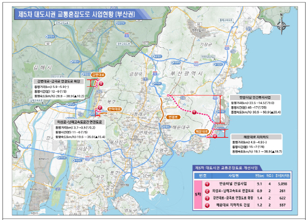 °æ³² ±èÇØ½Ã ÃÊÁ¤IC¿¡¼­ ºÎ»ê ±âÀ屺 ¿À½Ã¸®¾Æ ÀÔ±¸¸¦ ÀÕ´Â ºÎ»ê¿ÜºÎ¼øÈ¯µµ·ÎÀÇ ¸¶Áö¸· ±¸°£ÀÎ ¹Ý¼ÛÅͳÎ(4Â÷·Î) °Ç¼³Àº Áö³­ 2021³â Á¦4Â÷ °èȹ ½ÉÀÇ ¶§´Â °æÁ¦¼ºÀÌ ºÎÁ·ÇÏ´Ù´Â ÀÌÀ¯·Î Å»¶ôÇß´Ù. ±×·¯³ª µ¿ºÎ»ê±ÇÀÇ Â÷·® Á¤Ã¼¸¦ ¸·°í ºÎ»êÀÇ µ¿¡¤¼­ ±ÕÇü¹ßÀüÀ» ÀÌ·ç·Á¸é ¹Ý¼ÛÅͳÎÀÌ ²À °Ç¼³µÅ¾ß ÇÑ´Ù´Â ½Ã¿Í Áö¿ª Á¤Ä¡±ÇÀÇ Àû±ØÀûÀÎ ³ë·Â ´öºÐ¿¡ ¸¶Ä§³» 5Â÷ °èȹ¿¡ Æ÷ÇԵƴÙ. ±¹ÅäºÎ´Â ½ÉÀÇ ¶§ ¹Ý¼ÛÅͳÎÀÌ ¸¸µé¾îÁö¸é ÇØ¿î´ë ¼¾ÅÒ2Áö±¸¿Í ¿À½Ã¸®¾Æ °ü±¤´ÜÁö°¡ °ð¹Ù·Î ¿¬°áµÉ ¼ö ÀÖ´Ù´Â Á¡À» ³ôÀÌ Æò°¡Çß´Ù. ÀÌ·² °æ¿ì À̵¿ ½Ã°£Àº ±âÁ¸ÀÇ 46ºÐ¿¡¼­ 17ºÐÀ¸·Î 29ºÐÀÌ ´ÜÃàµÈ´Ù. ±æÀÌ´Â 9.1§°À̸ç Àüü »ç¾÷ºñ´Â 5098¾ï ¿øÀÌ´Ù. ±¹ºñ´Â 1348¾ï ¿øÀÌ Áö¿øµÈ´Ù.