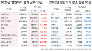 ¿µ¾÷ÀÌÀÍ Áõ°¡¾×¿¡¼µµ SKÇÏÀ̴нº°¡ 23Á¶7390¾ï¿ø(101.2%¡è)À¸·Î ¾ÐµµÀû 1À§¸¦ Â÷ÁöÇß°í, ÀÌ¾î »ï¼ºÀüÀÚ (10Á¶8751¾ï¿ø¡¤33.2%¡è), Çѱ¹Àü·Â°ø»ç(5Á¶1259¾ï ¿ø¡¤61.3%¡è)°¡ µÚ¸¦ À̾ú´Ù. ƯÈ÷ Çö´ë°Ç¼³Àº Áö³ÇØ ÀûÀÚ¿¡¼ ¹þ¾î³ª¸ç ¿µ¾÷ÀÌÀÍÀÌ 1Á¶9164¾ï¿ø Áõ°¡ÇØ ÈæÀÚÀüȯ Çß°í À̾î ÇÑÈ(1Á¶7308¾ï ¿ø¡¤71.6%¡è), KT(1Á¶6596¾ï ¿ø¡¤205.0%¡è), ÇÑÈ¿¡¾î·Î½ºÆäÀ̽º(1Á¶3574¾ï ¿ø¡¤78.4%¡è), HDÇö´ëÁß°ø¾÷(1Á¶3323¾ï ¿ø¡¤188.9%¡è), LGµð½ºÇ÷¹ÀÌ(1Á¶776¾ï ¿ø¡¤ÈæÀÚÀüȯ), ÇÑÈ¿À¼Ç(9297¾ï ¿ø¡¤390.8%¡è)ÀÌ 10À§±Ç¿¡ µé¾ú´Ù.