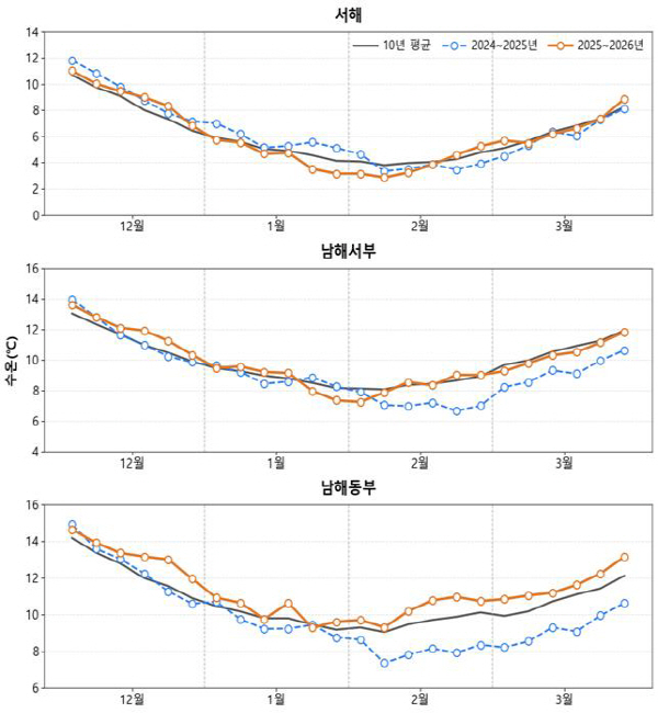 ±¹¸³¼ö»ê°úÇпøÀº Áö³­ÇØ 12¿ùºÎÅÍ ¿ÃÇØ 3¿ù±îÁö ¿ì¸® ¹Ù´ÙÀÇ ¼ö¿Â º¯µ¿À» ºÐ¼®ÇÑ °á°ú, Æò³â´ëºñ 1µµ Á¤µµ ³ôÀº ¼ö¿ÂÀÌ Áö¼ÓµÆ´Ù°í 10ÀÏ ¹àÇû´Ù.