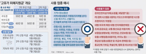 ½Å¿ë¡¤Ã¼Å©Ä«µå ¶Ç´Â ¼±ºÒÄ«µå·Î Áö±Þ ¹ÞÀº ±¹¹ÎÀº ÀϺΠ¾÷Á¾À» Á¦¿ÜÇÏ°í ¿¬¸ÅÃâ¾×ÀÌ 30¾ï ¿ø ÀÌÇÏÀÎ ¼Ò»ó°øÀÎ ¸ÅÀå µî¿¡¼­ ÇÇÇØÁö¿ø±ÝÀ» »ç¿ëÇÒ ¼ö ÀÖ´Ù. »ç¿ë Á¦ÇÑ ¾÷Á¾Àº ´ëÇ¥ÀûÀ¸·Î ¿Â¶óÀÎ ¼îÇθô¡¤¹è´Þ¾Û, À¯È»çÇà¾÷Á¾, ȯ±Ý¼º ¾÷Á¾ µîÀÌ´Ù. ÀϹÝÀûÀÎ Áö¿ª»ç¶û»óǰ±Ç »ç¿ë °¡´É ¾÷Á¾°ú À¯»çÇÑ ¼öÁØÀÌ´Ù. ´Ü ¹è´Þ¾ÛÀº °¡¸ÍÁ¡ ÀÚü ´Ü¸»±â¸¦ ÅëÇØ ´ë¸é °áÁ¦(¡®¸¸³ª¼­ °áÁ¦¡¯ ¹æ½Ä µî)ÇÏ¸é »ç¿ëÇÒ ¼ö ÀÖ´Ù.