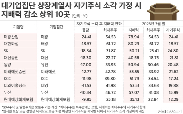 ÀÚ»çÁÖ ¼Ò°¢ ÀÌÈÄ ±â¾÷ ÃѼöÀÇ Áö¹è·Â(ÃÖ´ëÁÖÁÖ ÁöºÐÀ²)ÀÌ 20% ¹Ì¸¸ÀÌ µÇ´Â ±â¾÷Àº »ï¼ºÀüÀÚ, ºÎ±¤¾àǰ, È£ÅڽŶó, ÇѼÖÄɹÌÄ®, ³×À̹ö¿´´Ù. ƯÈ÷ »ï¼ºÀüÀÚ´Â Áö³´Þ ¸» ±âÁØ Áö¹è·ÂÀÌ 21.91%(ÀÚ»çÁÖ 2.21%, ÃÖ´ëÁÖÁÖ 19.71%)¿¡ ´ÞÇßÁö¸¸ 4¿ù ÃÊ ÀÚ»çÁÖ 1.24%¸¦ ¼Ò°¢ÇÑ ÈÄ Áö¹è·ÂÀÌ 19.95%·Î ³·¾ÆÁ³´Ù. »ï¼ºÀüÀÚ´Â ÁÖ½Ä ¼Ò°¢ ÈÄ ³²Àº ÀÚ»çÁÖ¸¦ 2027³â Á¤±âÁÖÃÑÀÏ Àü±îÁö ÀÓÁ÷¿ø º¸»ó ¸ñÀûÀ¸·Î óºÐÇÒ °èȹÀÌ´Ù.