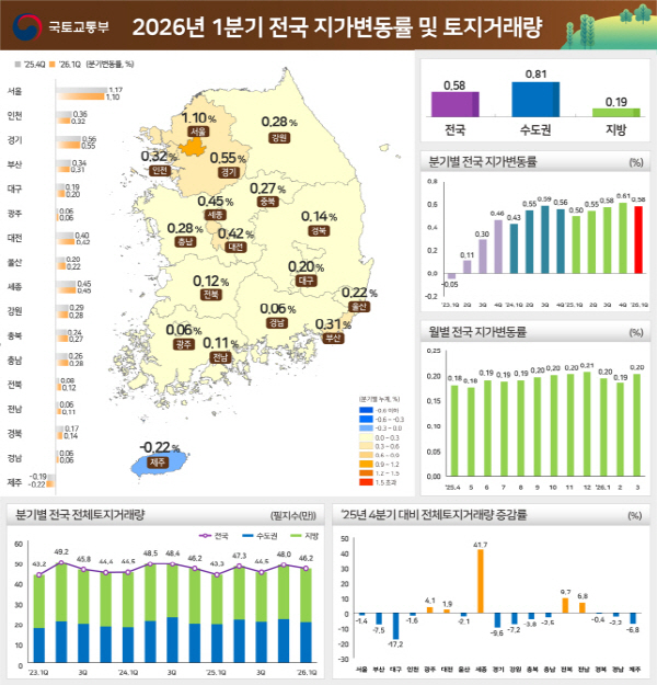 23ÀÏ ±¹Åä±³ÅëºÎ¿Í Çѱ¹ºÎµ¿»ê¿ø¿¡ µû¸£¸é ¿ÃÇØ 1~3¿ù Àü±¹ÀÇ Áö°¡ »ó½Â·üÀº 0.58%·Î Áý°èµÆ´Ù. Áö³­ÇØ 4ºÐ±â(0.61%)º¸´Ù 0.03%Æ÷ÀÎÆ® ³»·ÈÀ¸³ª Àü³â µ¿±â(0.50%)¿¡ ºñÇØ¼­´Â 0.08%Æ÷ÀÎÆ® ¿Ã¶ú´Ù. ÀÌ ¼öÄ¡´Â 2023³â 3¿ù(0.008%)ºÎÅÍ 37°³¿ù ¿¬¼Ó »ó½Â¼¼¸¦ º¸ÀδÙ. Áö¿ªº° Áö°¡ º¯µ¿·üÀº ¼öµµ±Ç 0.81%, ºñ¼öµµ±Ç 0.19%·Î »óÈ£ °ÝÂ÷°¡ ÄÇ´Ù. Àü±¹ Æò±Õº¸´Ù ³ôÀº ½Ã¡¤µµ´Â ¼­¿ï(1.10%)ÀÌ À¯ÀÏÇß´Ù. ¼­¿ïÀÇ »ó½Â ÆøÀº Àü±¹ Æò±ÕÀÇ ¹è¿¡ °¡±î¿î ¼öÄ¡´Ù. 2À§´Â °æ±â(0.55%)¿´´Ù.