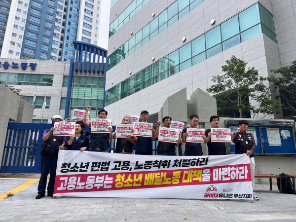 ¹ÎÁÖ³ëÃÑ °ø°ø¿î¼ö³ëÁ¶¿Í ³ëÁ¶ »êÇÏ ¶óÀÌ´õÀ¯´Ï¿ÂÁöºÎ ºÎ»êÁöȸ´Â Áö³ 24ÀÏ ºÎ»ê ¿¬Á¦±¸ °í¿ë³ëµ¿Ã»¿¡¼ ±âÀÚȸ°ßÀ» ¿°í û¼Ò³â ¹è´Þ ³ëµ¿ ´ëÃ¥ ¸¶·ÃÀ» ¿ä±¸Çß´Ù°í 25ÀÏ ¹àÇû´Ù. À̵éÀº ¡°¹è´ÞÀǹÎÁ·, ÄíÆÎÀÌÃ÷ °°Àº ´ëÇü ¹è´Þ Ç÷§Æû»çÀÇ ¹æÁ¶ ¾Æ·¡ û¼Ò³âÀÌ À§ÇèÇÑ ¹è´Þ ³ëµ¿À¸·Î ³»¸ô¸°´Ù. û¼Ò³âÀº ±Ù·Î±âÁعý¿¡ µû¶ó ÇÏ·ç 7½Ã°£ ÀÌ»ó ±Ù·Î¸¦ ÇÒ ¼ö ¾ø°í, ¾ß°£¡¤½É¾ß¡¤ÈÞÀϱٷεµ ±ÝÁöµÈ´Ù. ÇÏÁö¸¸ û¼Ò³â ¹è´Þ³ëµ¿ÀÚ´Â ÇÏ·ç 12½Ã°£ ³ëµ¿Àº ±âº»À̰í, »õº® 1½Ã¿¡µµ, »õº® 6½Ã¿¡µµ ¾÷üÀÇ Áö½Ã¿¡ µû¶ó ¹è´ÞÀ» ÇØ¾ß Çß°í, ÈÞÀϵµ ¾ø¾ú´Ù. û¼Ò³â ¹è´Þ ³ëµ¿ÀÚ´Â ¹ýÀÇ »ç°¢Áö´ë¿¡¼ ³ëµ¿ÂøÃë´Â ÀÏ»óȵŠÀÖ´Ù¡±°í À̾߱âÇß´Ù.
