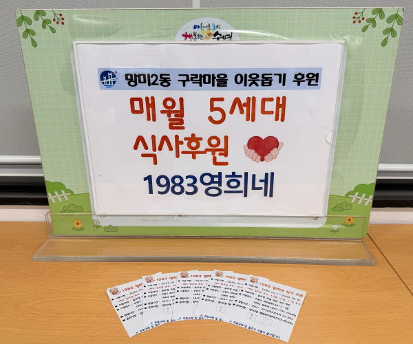 ºÎ»ê±¤¿ª½Ã ¼ö¿µ±¸ ¸Á¹Ì2µ¿ ÇàÁ¤º¹Áö¼¾ÅÍ(µ¿Àå ÀÌÀºÈñ)´Â °ü³» ½Ä´çÀÎ 1983¿µÈñ³×(´ëÇ¥ ¹Úµ¿ÈÖ)¿¡¼ 2025³â 10¿ùºÎÅÍ ¿ù 1ȸ ¹Ì¼º³â Àڳడ ÀÖ´Â Àú¼Òµæ Ãë¾à°èÃþ 5¼¼´ë¿¡°Ô ½Ä»ç¸¦ ÈÄ¿øÇÑ´Ù°í ¹àÇû´Ù.