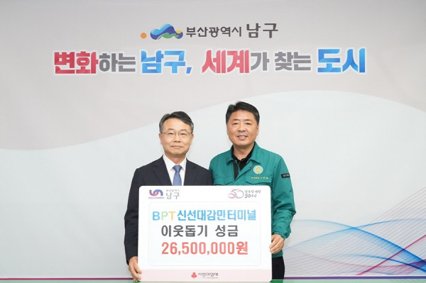 ½Å¼±´ë°¨¸¸Å͹̳Î(´ëÇ¥ÀÌ»ç ÀÌÁ¤Çà)ÀÌ Áö¿ª»çȸ ¾î·Á¿î ÀÌ¿ôÀ» µ½±â À§ÇØ ºÎ»ê ³²±¸(±¸Ã»Àå ¿ÀÀºÅÃ)¿¡ ÀÌ¿ôµ½±â ¼º±Ý 2650¸¸ ¿øÀ» Àü´ÞÇß´Ù.