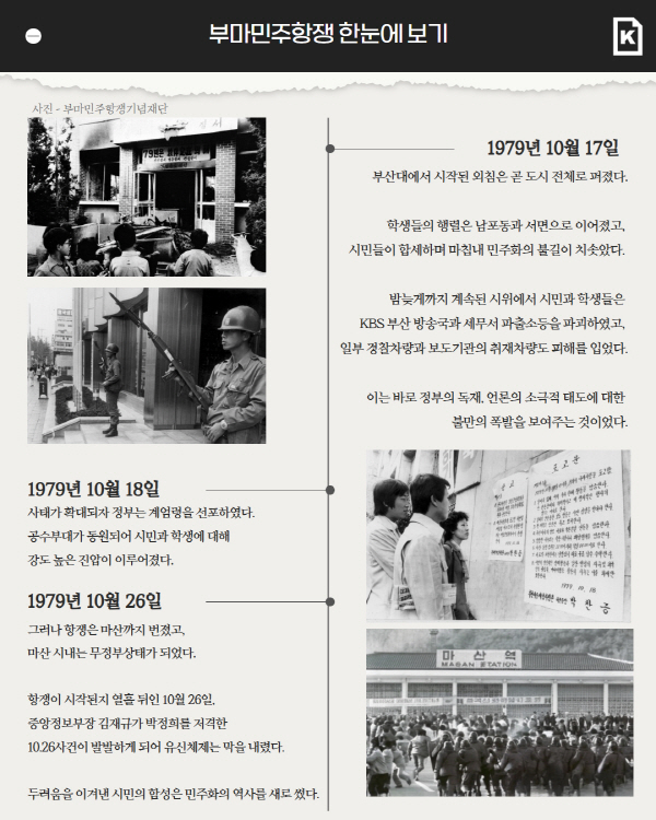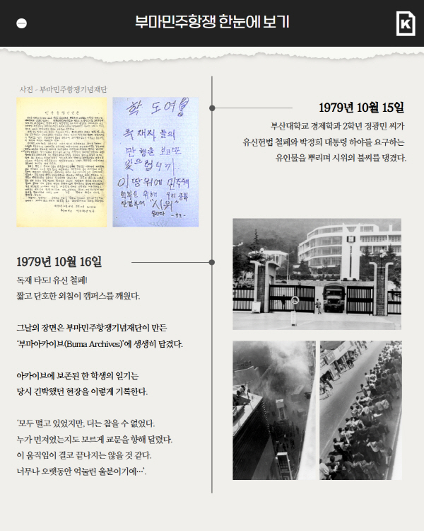 1979³â 10¿ù 16ÀÏ ¿ÀÀü. ¡°Ã»³â Çеµ¿©, Áö±Ý ³ÊÈñµéÀº ¹«¾ùÀ» Çϰí Àִ°¡.¡± ºÎ»ê´ëÇб³ °æÁ¦Çаú 2Çгâ Á¤±¤¹Î ¾¾°¡ À¯½ÅÇå¹ý öÆó¿Í ¹ÚÁ¤Èñ ´ëÅë·É ÇϾ߸¦ ¿ä±¸ÇÏ´Â À¯Àι°À» »Ñ¸®¸ç ½ÃÀ§ÀÇ ºÒ¾¾¸¦ ´ó°å´Ù. µµ¼°üÀ» Áö³ª ¿îµ¿ÀåÀ» µ¹ ¹«·Æ, Çà·Ä¿¡ ¼± Çлý ¼ö´Â ¼ö¹é¿¡¼ ¼öõÀ¸·Î ´Ã¾ú´Ù. ±×³¯ÀÇ Àå¸éÀº ºÎ¸¶¹ÎÁÖÇ×Àï±â³äÀç´ÜÀÌ ¸¸µç ¡®ºÎ¸¶¾ÆÄ«À̺ê(Buma Archives)¡¯¿¡ »ý»ýÈ÷ ´ã°å´Ù. ¾ÆÄ«À̺꿡 º¸Á¸µÈ ÇÑ ÇлýÀÇ Àϱâ´Â ´ç½Ã ±ä¹ÚÇß´ø ÇöÀåÀ» ÀÌ·¸°Ô ±â·ÏÇÑ´Ù.