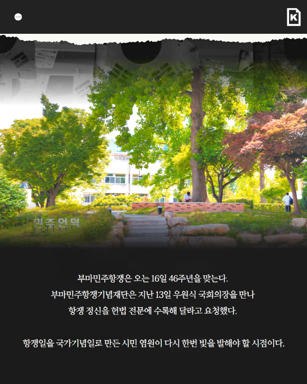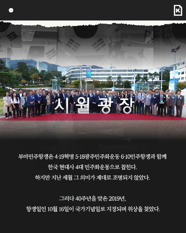 ºÎ¸¶¹ÎÁÖÇ×ÀïÀº 4¡¤19Çõ¸í 5¡¤18±¤ÁÖ¹ÎÁÖȿ 6¡¤10¹ÎÁÖÇ×Àï°ú ÇÔ²² Çѱ¹ Çö´ë»ç 4´ë ¹ÎÁÖȿÀ¸·Î ²ÅÈù´Ù. ÇÏÁö¸¸ Áö³ ¼¼¿ù ±× Àǹ̰¡ Á¦´ë·Î Á¶¸íµÇÁö ¾Ê¾Ò´Ù. ±×·¯´Ù 40ÁÖ³âÀ» ¸ÂÀº 2019³â, Ç×ÀïÀÏÀÎ 10¿ù 16ÀÏÀÌ ±¹°¡±â³äÀÏ·Î ÁöÁ¤µÇ¸ç À§»óÀ» ã¾Ò´Ù.