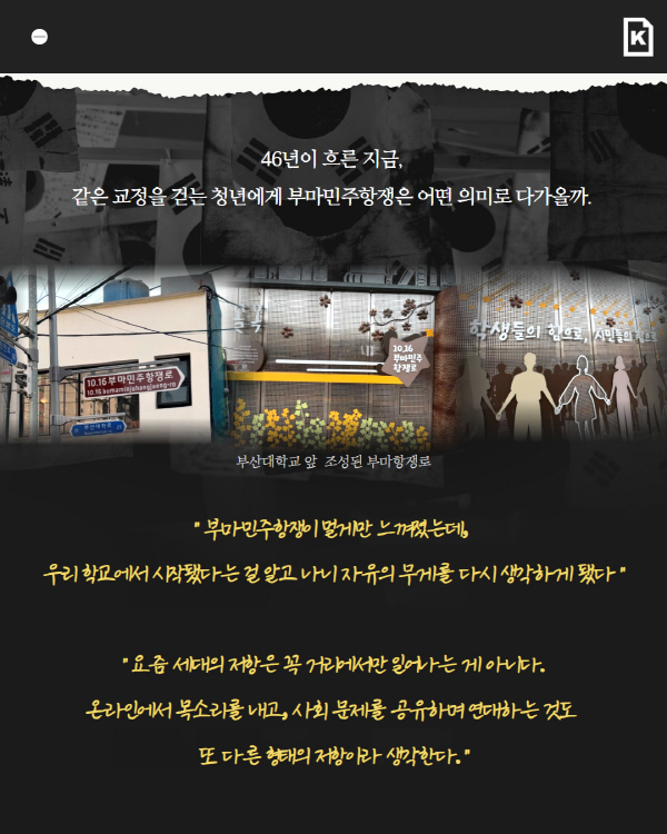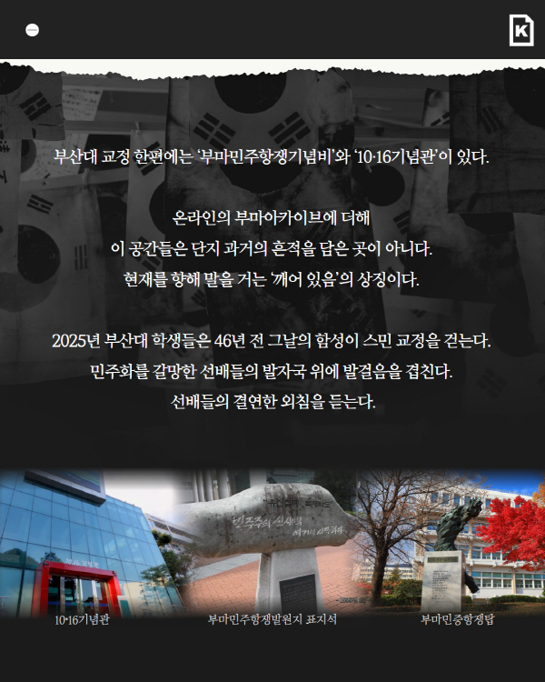 ºÎ»ê´ë ±³Á¤ ÇÑÆí¿¡´Â ¡®ºÎ¸¶¹ÎÁÖÇ×Àï±â³äºñ¡¯¿Í ¡®10¡¤16±â³ä°ü¡¯ÀÌ ÀÖ´Ù. ¿Â¶óÀÎÀÇ ºÎ¸¶¾ÆÄ«À̺꿡 ´õÇØ ÀÌ °ø°£µéÀº ´ÜÁö °ú°ÅÀÇ ÈçÀûÀ» ´ãÀº °÷ÀÌ ¾Æ´Ï´Ù. ÇöÀ縦 ÇâÇØ ¸»À» °Å´Â ¡®±ú¾î ÀÖÀ½¡¯ÀÇ »ó¡ÀÌ´Ù. 2025³â ºÎ»ê´ë ÇлýµéÀº 46³â Àü ±×³¯ÀÇ ÇÔ¼ºÀÌ ½º¹Î ±³Á¤À» °È´Â´Ù. ¹ÎÁÖȸ¦ °¥¸ÁÇÑ ¼±¹èµéÀÇ ¹ßÀÚ±¹ À§¿¡ ¹ß°ÉÀ½À» °ãÄ£´Ù. ¼±¹èµéÀÇ °á¿¬ÇÑ ¿ÜħÀ» µè´Â´Ù.