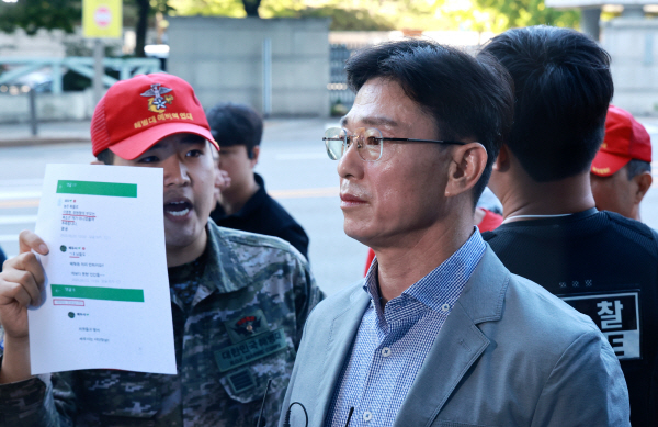ÀÓ¼º±Ù Àü ÇØº´´ë 1»ç´ÜÀåÀÌ 11ÀÏ ¼¿ï ¼Ãʱ¸ ¼øÁ÷ÇØº´Æ¯°Ë »ç¹«½Ç ¾Õ¿¡¼ Ư°ËÆÀ°úÀÇ ¸é´ãÀ» ½ÃµµÇÏ´Ù°¡ ÃâÀÔÀÌ ¸·Èù µÚ ÇØº´Àü¿ìȸ¿øµéÀÇ Ç×ÀǸ¦ ¹Þ°í ÀÖ´Ù. ¿¬ÇÕ´º½º
