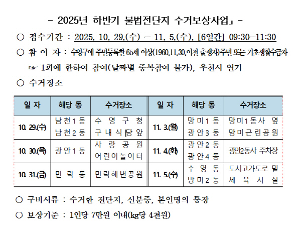 ºÎ»ê±¤¿ª½Ã ¼ö¿µ±¸(±¸Ã»Àå °¼ºÅÂ)´Â 10¿ù 29ÀÏ(¼ö)ºÎÅÍ 11¿ù 5ÀÏ(¼ö)±îÁö ¡¸2025³â ÇϹݱ⠺ҹýÀü´ÜÁö ¼ö°Åº¸»ó»ç¾÷¡¹À» ½Ç½ÃÇÑ´Ù°í ¹àÇû´Ù.