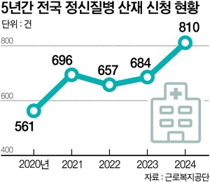 ¹Ý¸é ÃÖ±Ù Á¤½ÅÁúº´ »êÀç ½Åû °Ç¼ö´Â Áõ°¡¼¼´Ù. ±Ù·Îº¹Áö°ø´ÜÀÇ ÃÖ±Ù 5³â(2020~2024)°£ Á¤½ÅÁúº´ »êÀçó¸® ÇöȲÀ» º¸¸é ÀÌ ±â°£ ½Åû °Ç¼ö´Â ÃÑ 3408°ÇÀÌ´Ù. ¿¬µµº°·Î´Â ¢¹2020³â 561°Ç ¢¹2021³â 696°Ç ¢¹2022³â 657°Ç ¢¹2023³â 684°Ç ¢¹2024³â 810°ÇÀÌ´Ù. °°Àº ±â°£ ÀûÀÀÀå¾Ö(1441°Ç)¿Í ¿ì¿ïÁõ(811°Ç) ½Åû °Ç¼ö°¡ ¸¹¾Ò´Ù.