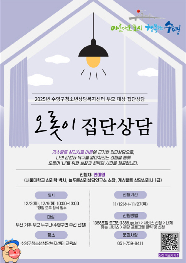 ºÎ»ê±¤¿ª½Ã ¼ö¿µ±¸(±¸Ã»Àå °¼ºÅÂ)´Â ¿À´Â 12¿ù 2ÀÏ(È)°ú 9ÀÏ(È) ¿ÀÀü 10½ÃºÎÅÍ ¿ÀÈÄ 1½Ã±îÁö ¼ö¿µ±¸Ã»¼Ò³â»ó´ãº¹Áö¼¾ÅÍ(¼¾ÅÍÀå ŹÈñ¿í)¿¡¼ ºÎ¸ð ´ë»ó Áý´Ü»ó´ã ¡®¿À·ÔÀÌ Áý´Ü»ó´ã¡¯À» ÁøÇàÇÑ´Ù°í ¹àÇû´Ù.