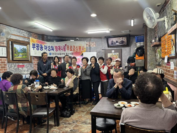 ºÎ»ê Áß±¸ ºÎÆòµ¿ ÀÚÀ¯ÃÑ¿¬¸Í¿©¼ºÈ¸(ȸÀå ÀÌÇâ¼÷)¿¡¼´Â 11¿ù12ÀÏ(¼ö) Èñ¸Á ¿ø·ÎÀÇ Áý ¹× ºÎÆò ¿ø·ÎÀÇ Áý ¾î¸£½Å 40¿© ¸í¿¡°Ô ¿µ¾ç°¡µæ º¸¾ç½Ä Ãß¾îÅÁÀ» ´ëÁ¢Çß´Ù.