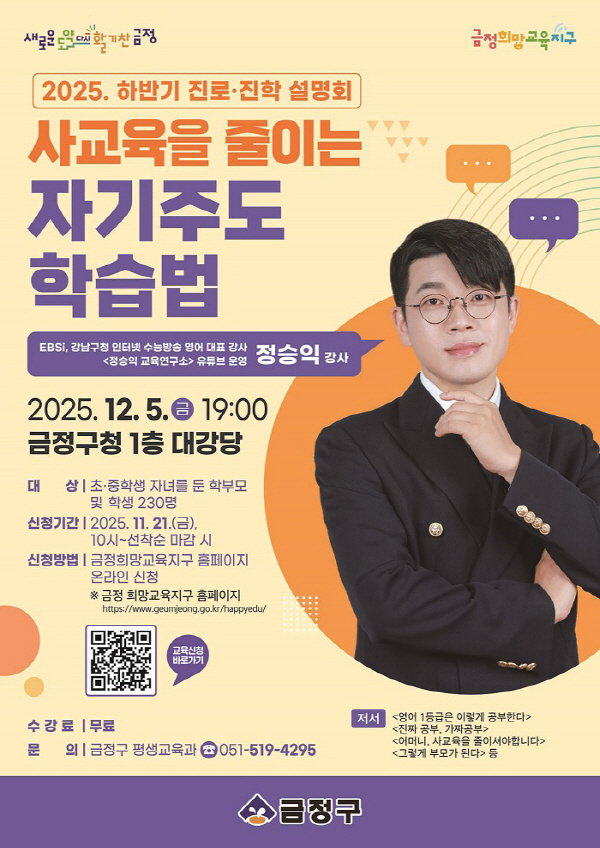 ºÎ»ê½Ã ±ÝÁ¤±¸ (±¸Ã»Àå À±ÀÏÇö)´Â 12¿ù 5ÀÏ Àú³á 7½Ã ±ÝÁ¤±¸Ã» ´ë°´ç¿¡¼ °ü³» ÃÊ¡¤ÁßÇлý°ú Çкθð 230¸íÀ» ´ë»óÀ¸·Î ¡®2025. ÇϹݱâ Áø·Î¡¤ÁøÇÐ ¼³¸íȸ Á¤½ÂÀÍ °»ç ÃÊû Ư°¡¯À» ÁøÇàÇÑ´Ù°í ¹àÇû´Ù.