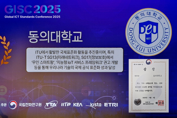 µ¿ÀÇ´ë(ÃÑÀå ÇѼöȯ)´Â Áö³ 11¿ù 3ÀÏ, ¼¿ï ¾çÀ絿 ¿¤Å¸¿ö¿¡¼ °³ÃÖµÈ ¡®±Û·Î¹ú ICT Ç¥ÁØ ÄÜÆÛ·±½º(GISC2025)¡¯¿¡¼ ±¹Á¦Àü±âÅë½Å¿¬ÇÕ(ITU)ÀÇ ±¹Á¦Ç¥ÁØÈ Ȱµ¿ ¼º°ú¸¦ ÀÎÁ¤¹Þ¾Æ, ºÎÃѸ® °â °úÇбâ¼úÁ¤º¸Åë½ÅºÎ Àå°ü»óÀ» ¼ö»óÇß´Ù.