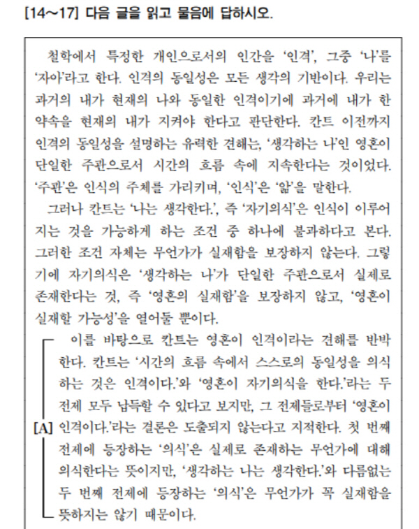 ÀÌÃæÇü Æ÷Ç×°ø´ë(Æ÷½ºÅØ) öÇаú ±³¼ö´Â ÇÑ ¼öÇè»ý Ä¿¹Â´ÏƼ °Ô½ÃÆÇ¿¡ ¡®±¹¾î 17¹ø ¹®Á¦ Á¦±â¡¯¶ó´Â Á¦¸ñÀÇ ±ÛÀ» ÅëÇØ ¡°¼ö´É ±¹¾î ½ÃÇè¿¡ ÄÆ® °ü·Ã ¹®Á¦°¡ ³ª¿Ô´Ù°í Çϱ⿡ Ç®¾î º¸¾Ò´Âµ¥ 17¹ø ¹®Ç׿¡ ´äÀÌ ¾ø¾î º¸¿´´Ù¡±°í ÁÖÀåÇß´Ù. À̹ø ¼ö´É °í³µµ ¹®Ç×À¸·Î ²ÅÈ÷´Â ±¹¾î 17¹øÀº µ¶ÀÏ Ã¶ÇÐÀÚ ÀÓ¸¶´©¿¤ ÄÆ®ÀÇ ÀÎ°Ý µ¿Àϼº¿¡ °üÇÑ °ßÇØ¸¦ ´ãÀº Áö¹®À» Àаí Ǫ´Â ¹®Á¦´Ù. µÎ³ú¿¡¼ ÀϾ´Â ÀǽÄÀ» ½ºÄµÇØ ÇÁ·Î±×·¥À¸·Î ÀçÇöÇÑ °æ¿ì, º»·¡ÀÇ ÀڽŰú ÀçÇöµÈ ÀǽÄÀº µ¿ÀÏÇÑ ÀΰÝÀÌ ¾Æ´Ï¶ó´Â ¡®°©¡¯ÀÇ ÁÖÀåÀ» Á¦½ÃÇÑ µÚ À̸¦ ÀÌÇØÇÑ ¹ÝÀÀÀ¸·Î °¡Àå ÀûÀýÇÑ °ÍÀ» ãÀ¸¶ó´Â ¹®Á¦¿´´Ù.