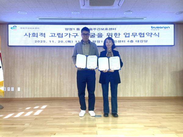 ºÎ»êÁø±¸ ¾çÁ¤1µ¿(µ¿Àå ¿À¸í¿Á)°ú ¢ßÇÑÀ½ÁÖ°£º¸È£¼¾ÅÍ(´ëÇ¥ Áø¿µ¶ô)´Â 11¿ù 20ÀÏ Áֹμ¾ÅÍ¿¡¼ »çȸÀû °í¸³°¡±¸ ¹ß±¼À» À§ÇÑ ¾÷¹« Çù¾àÀ» ü°áÇÏ¿´´Ù.