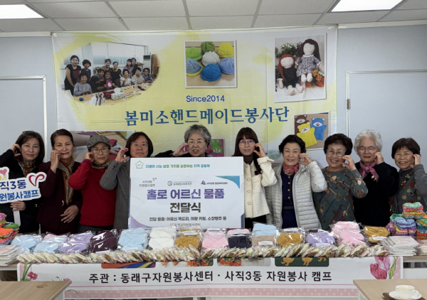 »çÁ÷3µ¿À» ±â¹ÝÀ¸·Î Ȱµ¿Çϰí ÀÖ´Â ¡®º½¹Ì¼Ò ÇÚµå¸ÞÀÌµå ºÀ»ç´Ü¡¯Àº 2014³âºÎÅÍ ÁÖ¹ÎÀÚġȸ ¹× µ¿·¡±¸ ÀÚ¿øºÀ»ç¼¾ÅÍ¿¡¼ Àç·áºñ¸¦ Áö¿ø¹Þ¾Æ ģȯ°æ ¼ö¼¼¹Ì, ¾î¸£½Å ¸ñµµ¸®, ۸µ, ¼ÒâÇàÁÖ µîÀ» Á¦ÀÛÇØ °ü³» 65¼¼ ÀÌ»ó Àú¼Òµæ ¾î¸£½Å ¹× Ãâ»ê °¡±¸¿¡ ¸Å³â ±âºÎ ¹°Ç°À» Àü´ÞÇØ ¿À°í ÀÖ´Ù.